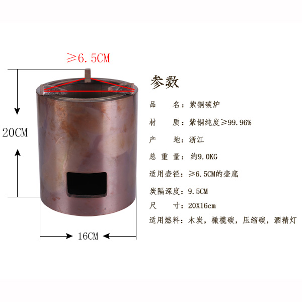 紫銅炭火爐(帶內膽),采用純紫銅,人工與機械設備相結合制作而成,產品厚重,敦實。炭火爐采用10毫米厚度純紫銅制作而成,通體純紫銅,耐高溫,可玩包漿。適用于5.5-10厘米壺底直徑,適用于銅壺,鐵壺,銀壺,陶瓷壺等耐高溫器具。
